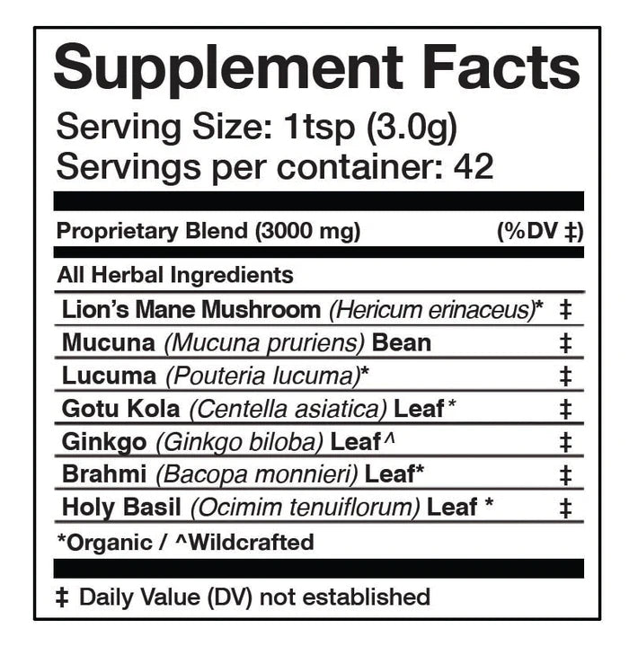 ZUTATEN: Löwenmähne*, Mucuna-Bohne, Lucuma*, Gotu-Kola-Blatt*, Ginkgo-Blatt^, Brahmi-Blatt*, Heiliges Basilikumblatt*