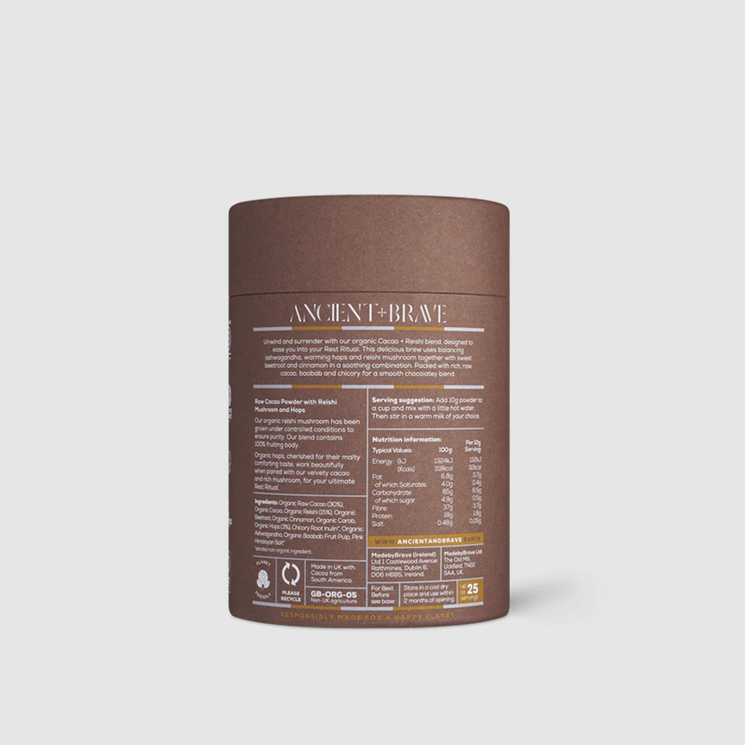This delicious raw cacao brew with balancing ashwagandha, warming hops and reishi mushroom crafted to transport you into a state of tranquillity in your Rest Ritual.