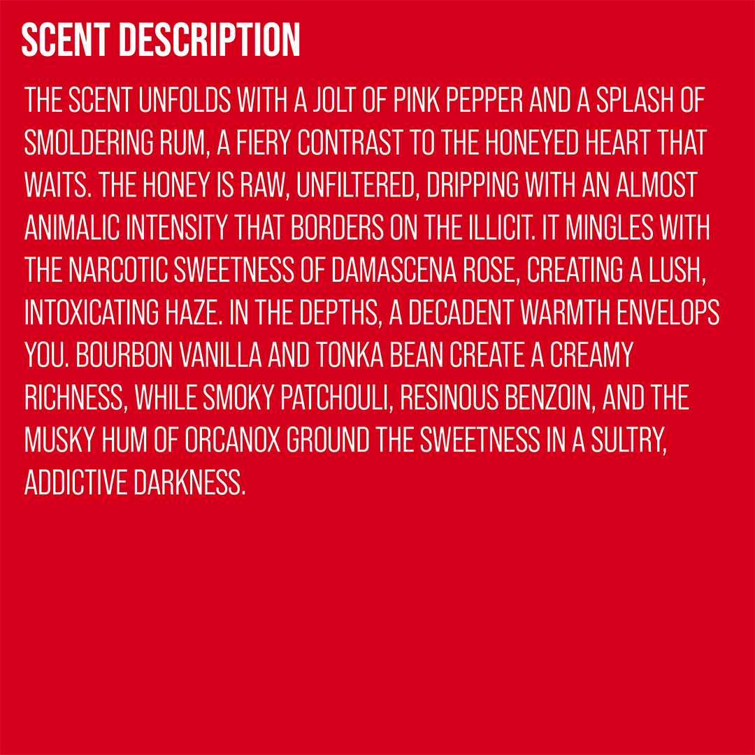 Base: Bourbon Vanilla, Tonka Bean, Patchouli, Benzoin Resinoid, Orcanox