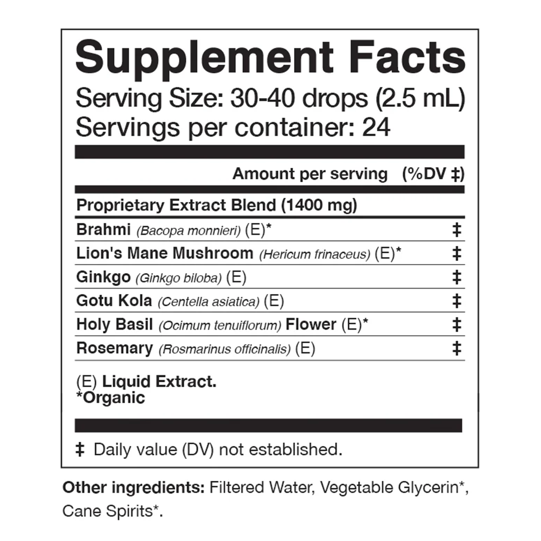 Zutaten : Brahmi*, Löwenmähnenpilz*, Ginkgoblatt, Gotu Kola, Heiliges Basilikum*, Rosmarin. Extrahiert in Zuckerrohrschnaps* und pflanzlichem Glycerin.