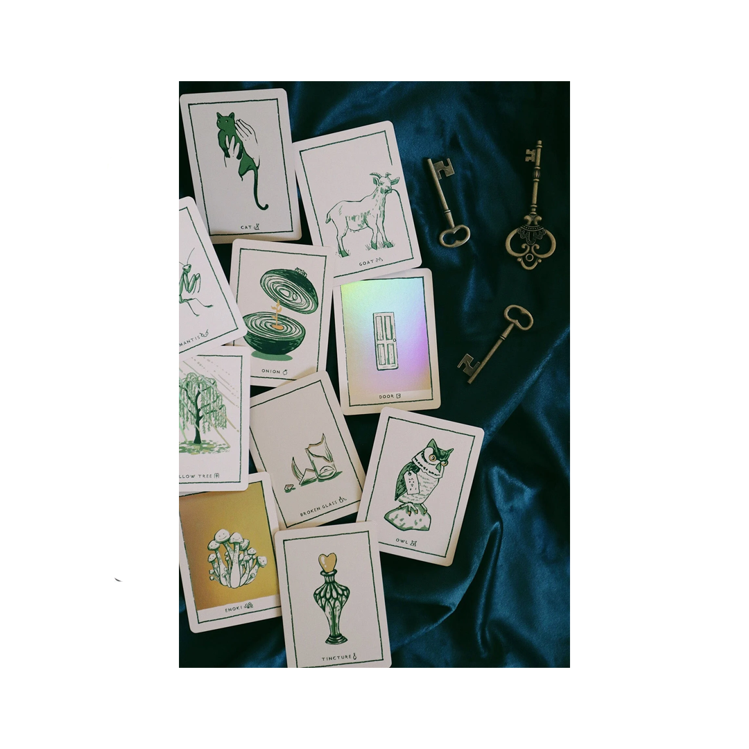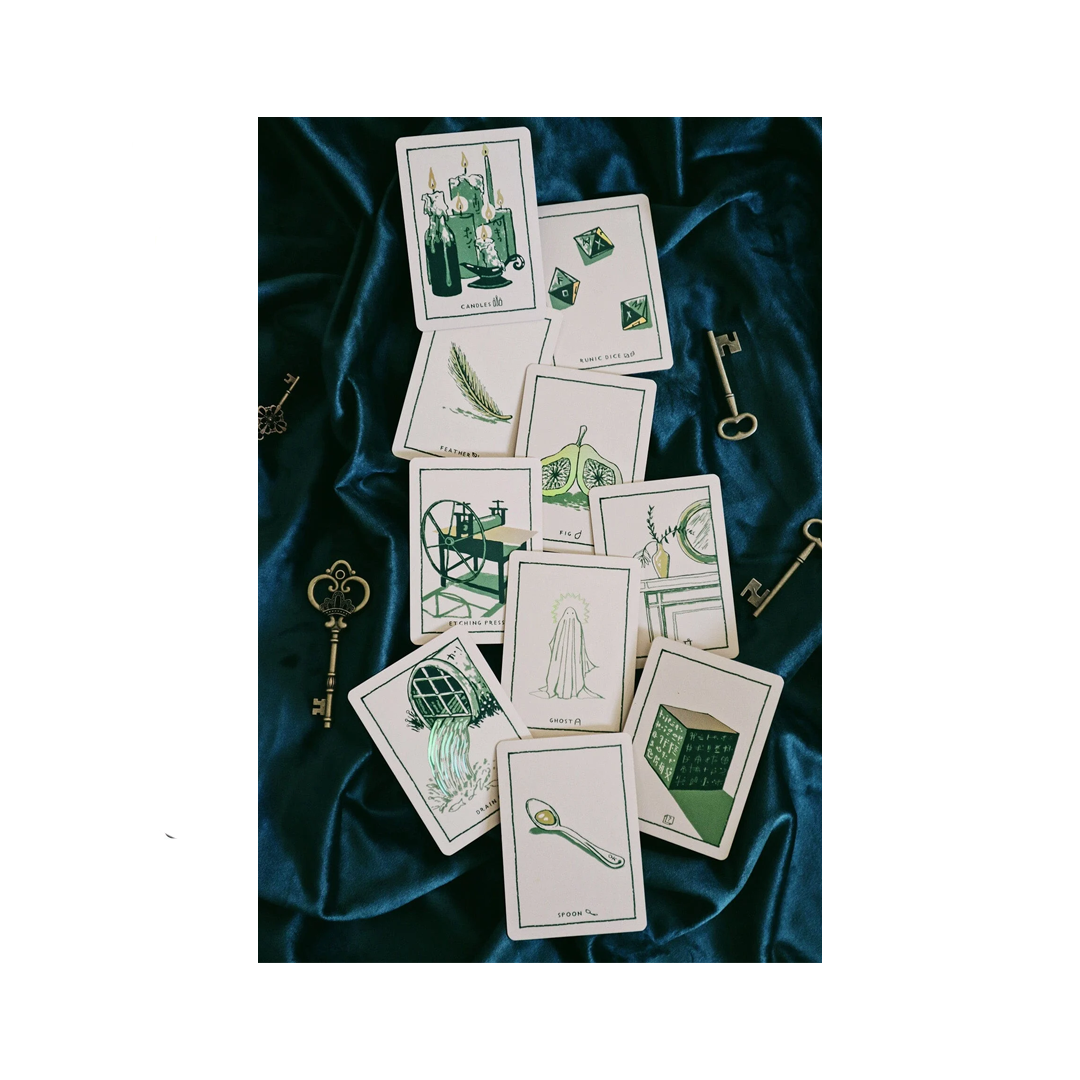 - DAS BOOKLET ist ebenfalls 7 x 12 cm groß, ca. 100 Seiten mit einer kurzen Einleitung. Der Leitfaden erkundet die Bilder jeder Karte und die damit verbundenen Bedeutungen, wunderschön geschrieben von Katherine Tombs.