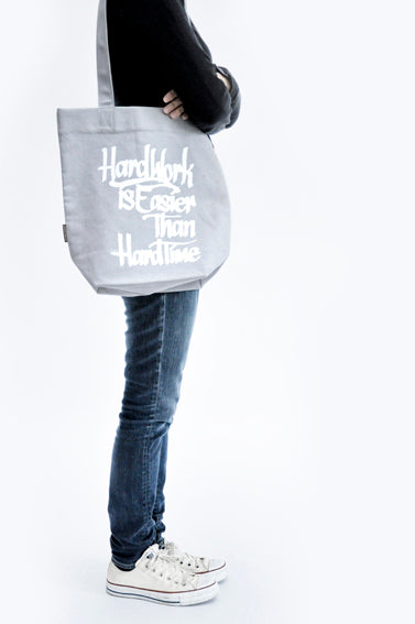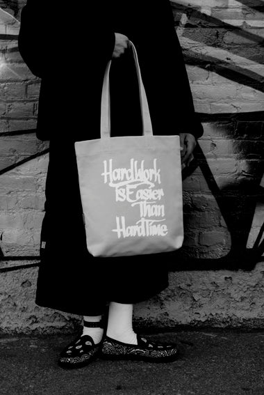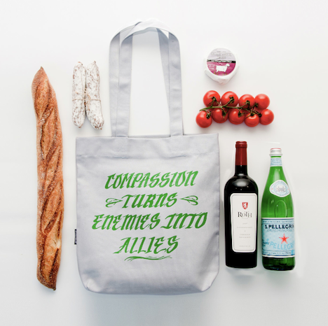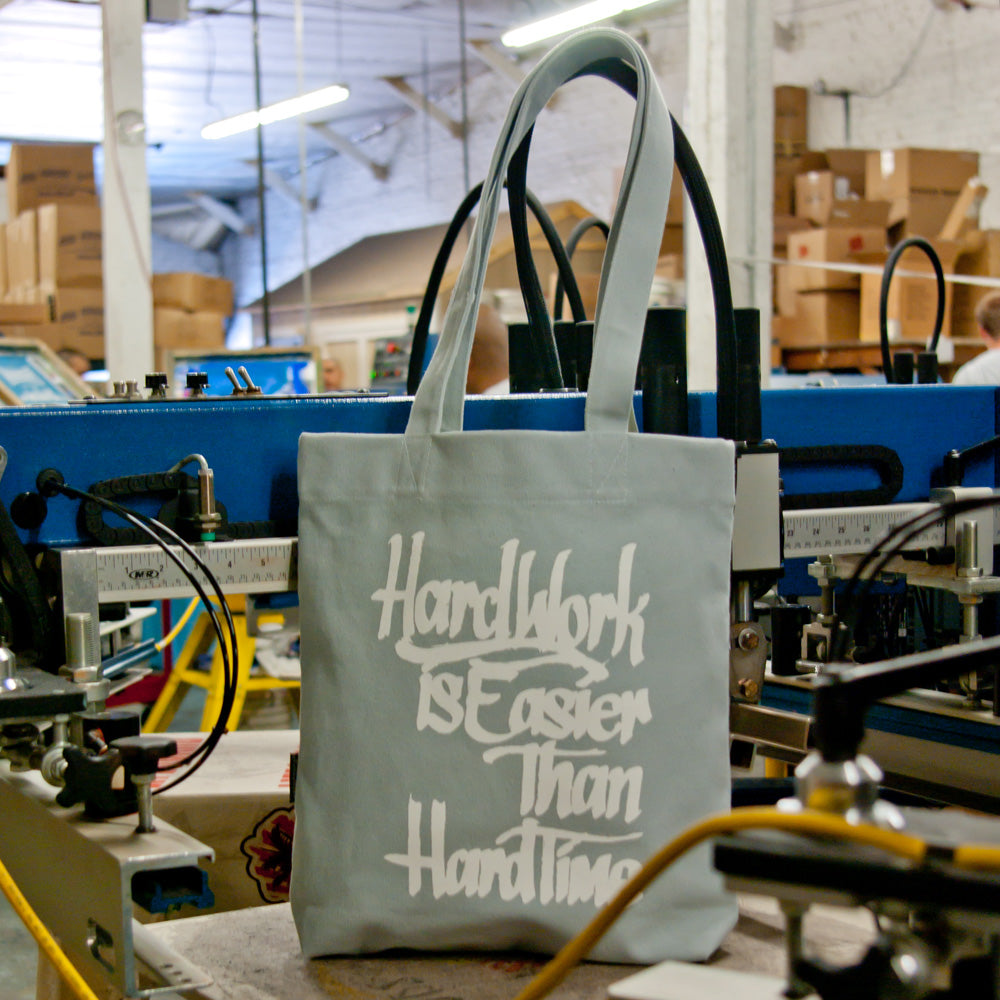Die Canvas-Tragetaschen wurden von ehemaligen Gang-Mitgliedern mit ihrer Originalkalligraphie im Siebdruckverfahren bedruckt, mit Slogans wie „Nothing Stops a Bullet Like a Job“ oder „Hard Work Is Easier Than Hard Time“.