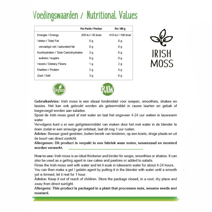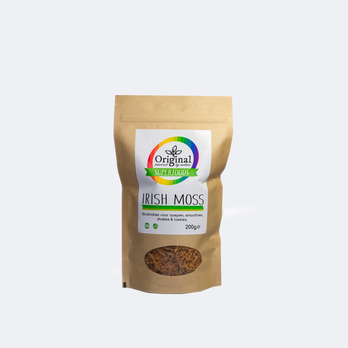 This Irish moss grows in its natural environment, the ocean, and is very suitable as a healthy thickener. Machinery, basins, tanks, containers and/or mass production are not used. It is wild-crafted and harvested by hand and then dried in the sun. Because it is a natural product and depending on many factors such as weather conditions, season, wave action and handwork, Irish moss can vary in colour, size, moisture and binding capacity. During the drying process, natural salts are released from the Irish moss. This means that no extra salt needs to be added.