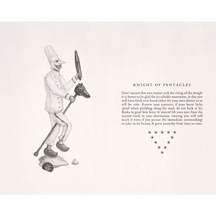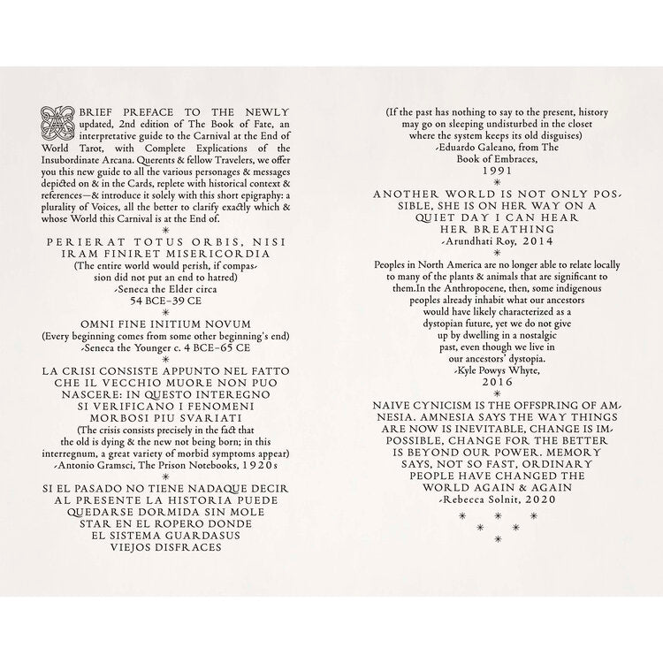 „Seitdem Menschen Tarotkarten zur Wahrsagerei verwenden, haben sich ihre Symbolik und Methoden weiterentwickelt, um mit dem gesellschaftlichen Wandel Schritt zu halten. Karneval am Ende der Welt Tarot hält sich an die Rider-Waite-Smith-Nomenklatur und Nummerierung für die großen Arkana und präsentiert auch Bildszenen und ähnliche Farben für die Pip-Karten für die kleinen Arkana, aber seine Ikonographie und interpretativen Werte sind unserer angemessen eigene unsichere Zeiten.