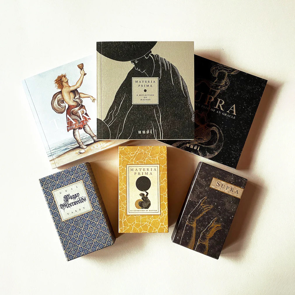Die Kernsammlung von Uusis bahnbrechenden Tarotkarten, Orakeldecks und Büchern: „Pagan Otherworlds“, „Supra“ und „Materia Prima“.