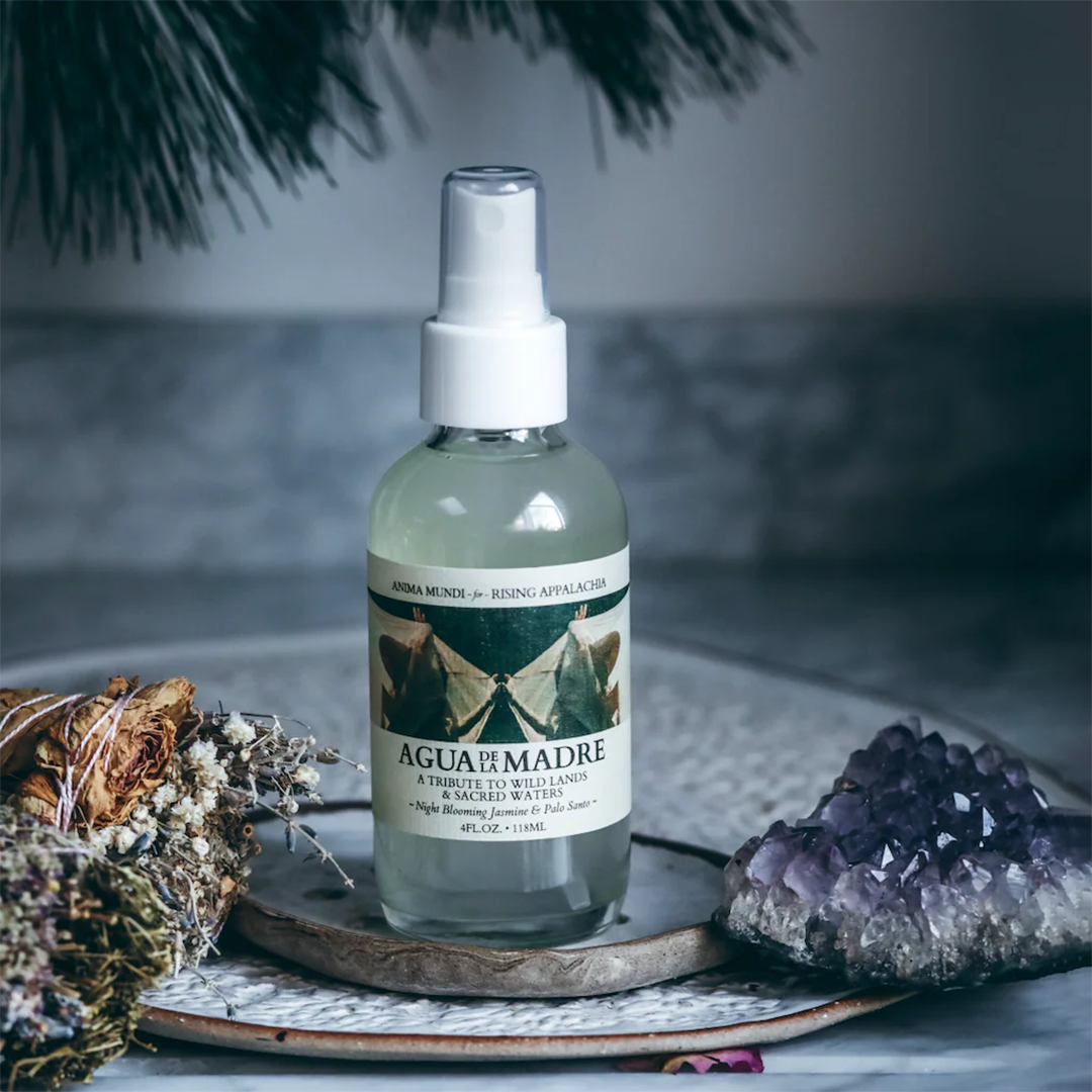 "Agua de la Madre is our most recent elemental ballad, a collection of folkloric imagery tied to our love for this wild and stunning earth, the elements of this continent, the power of water and the lands of our North, Central and South American families. It was written and released only DAYS before the catastrophic Hurricane Helene hit Southern Appalachia and changed all our lives forever. It was originally written as a love letter to place, and a love letter between land and sea, and the story of water. Now its meaning has changed so much, being an homage to water after SO much water has ripped through our homes and communities as the rivers rose nearly 19 ft past their banks and swept our towns, studies and homes away. We built the herbal essence Agua de la Madre with our incredible friends of Anima Mundi as a powerful magic essence tied to protection and folk herbalism. And now we are equally inspired to tie this herbal essence to the lands of Southern Appalachia where the bio-diversity is so potent. Agua de la Madre is now part of the relief and recovery work of the Appalachian Mountains." - Leah Song, Rising Appalachia