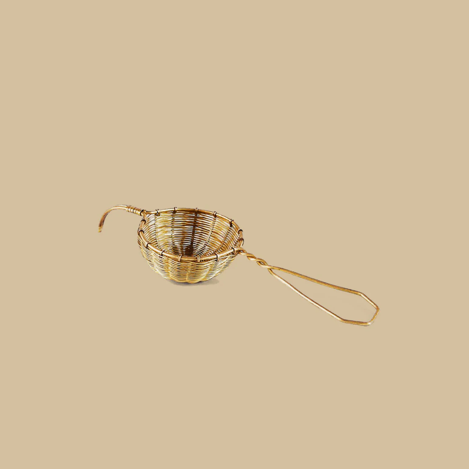 The simple and elegant tea basket is handmade of solid brass. Designed to perch on the edge of a mug, the tightly woven basket strains leaves from a larger pot into a single serving. Or this strainer is excellent for teas that should not be steeped for long periods of time, such as flowers like Blue Lotus.