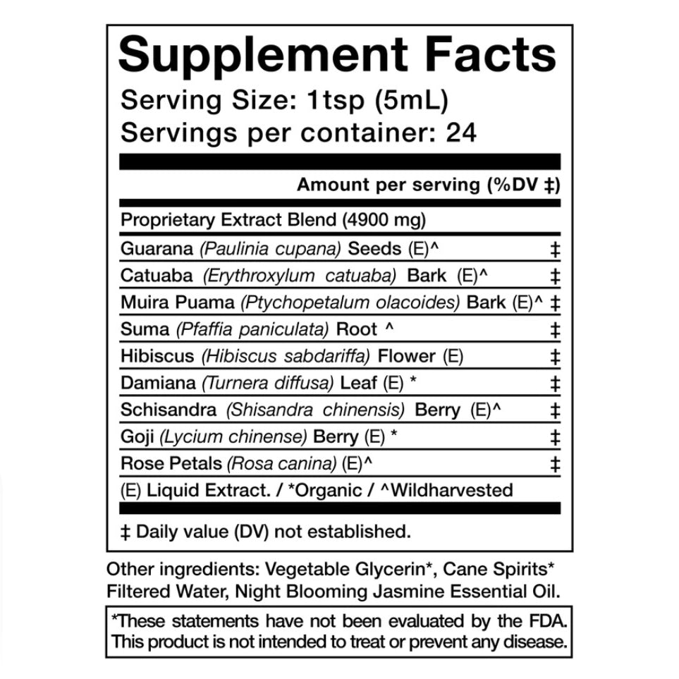 INGREDIENTS: Guarana Seeds (Paulina cupana) (E)^, Catuaba Bark (Erythroxylum catuaba) (E)^, Muira Puama Bark (Ptychopetalum olacoides) (E)^, Suma Root (Pfaffia paniculata)^, Hibiscus Flower (Hibiscus sabdariffa) (E), Damiana Leaf (Turnera diffusa) (E)*, Schisandra Berry (Schisandra chinesis) (E)^, Goji Berry (Lycium chinense) (E)*, Rose Petals (Rosa canina) (E)^. Other ingredients: Vegetable Glycerin*, Cane spirits*, Filtered Water, Night Blooming Jasmine Essential Oil.