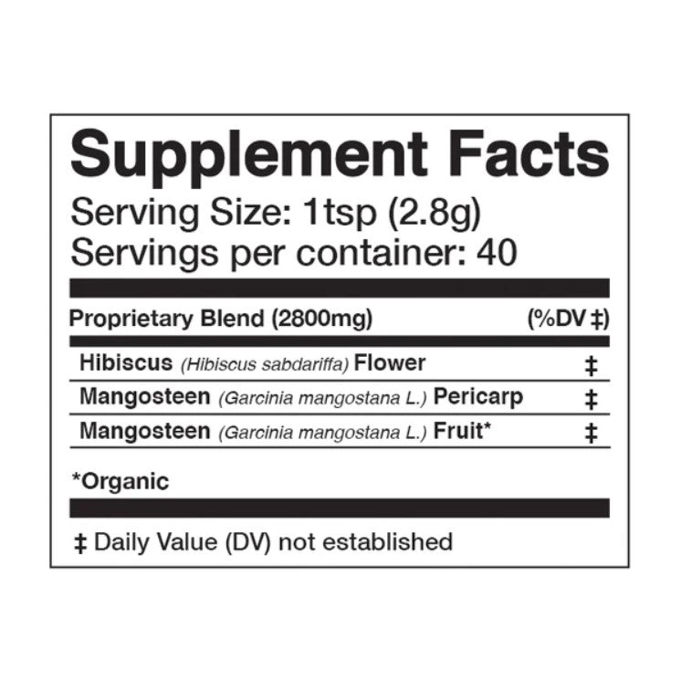 INGREDIENTS: Hibiscus Flower (Hibiscus sabdariffa), Mangosteen Pericarp (Garcinia mangostana L.), Mangosteen Fruit (Garcinia mangostana L.).*