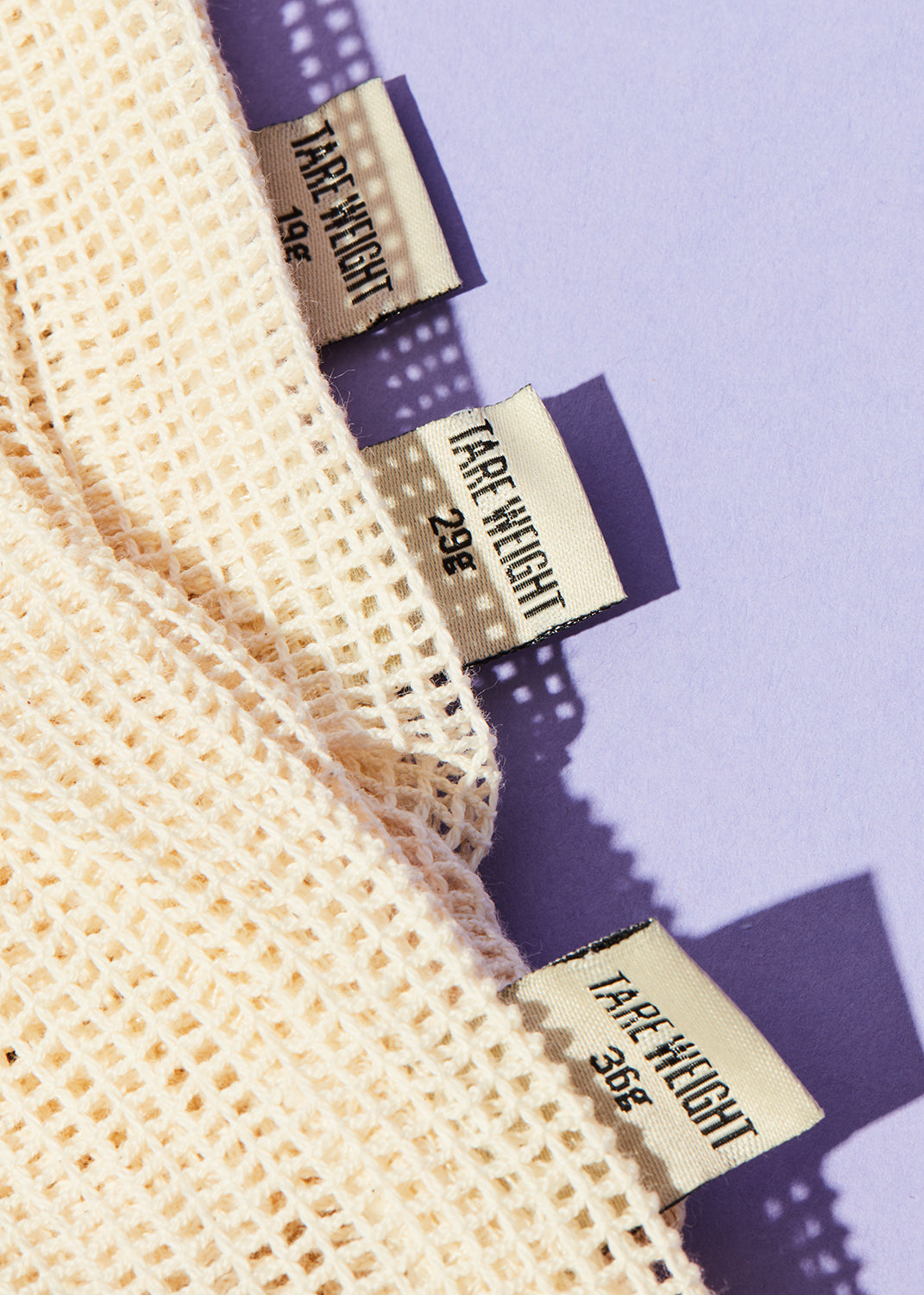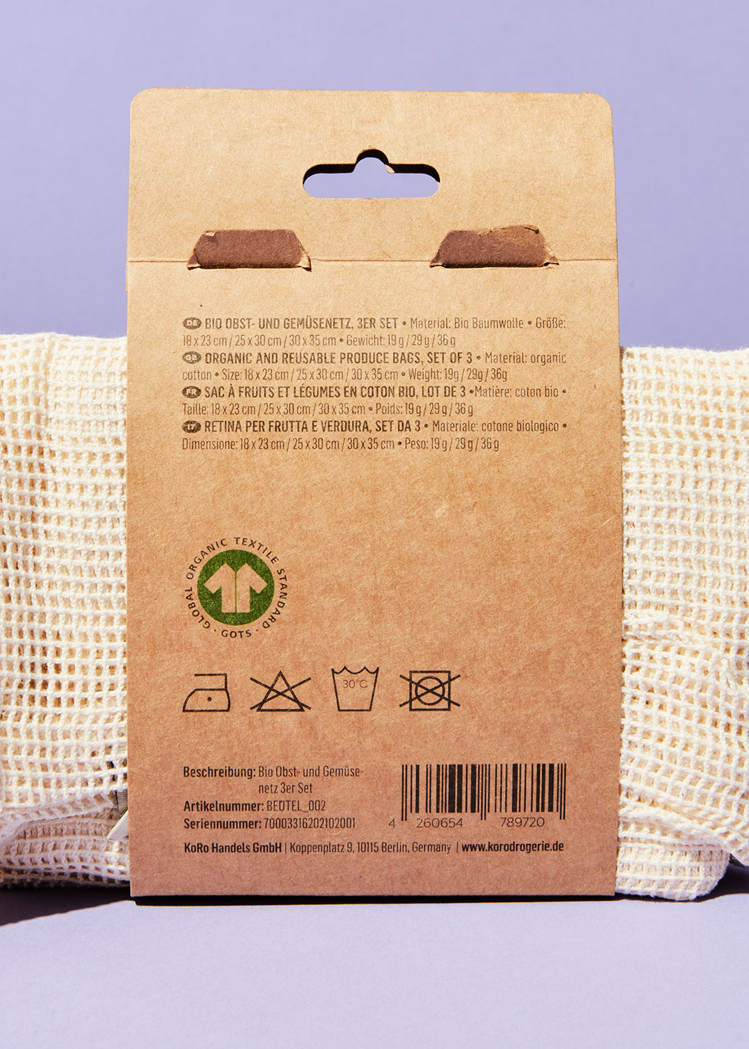 Koro's vegetable bags are made of 100% organic cotton, which is literally the only material they use. What's better than one vegetable bag? That's right, three vegetable bags in different sizes. Whether it's a small piece of ginger, a few zucchinis or a kilo of apples - thanks to the different sizes (S, M, L) you can fit it all in this vegetable or fruit bags. They are lightweight, yet sturdy, so they can withstand even heavy fruit and vegetables.