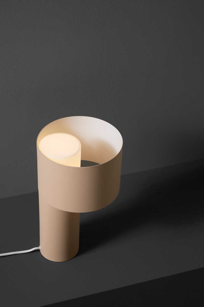 Tangent table lamp arose from an experimental study with tubes and proportion and how these can be joined together. A clean graphical design where two steel tubes meet at their tangential point of contact. The small tube provides space for the electrics while the large tube functions as the lamp shade. On top of the inner metal tube is a shade made of opal glass that covers the bulb creating a soft light when turned on and a visual effect of one cylindrical tube when turned off.