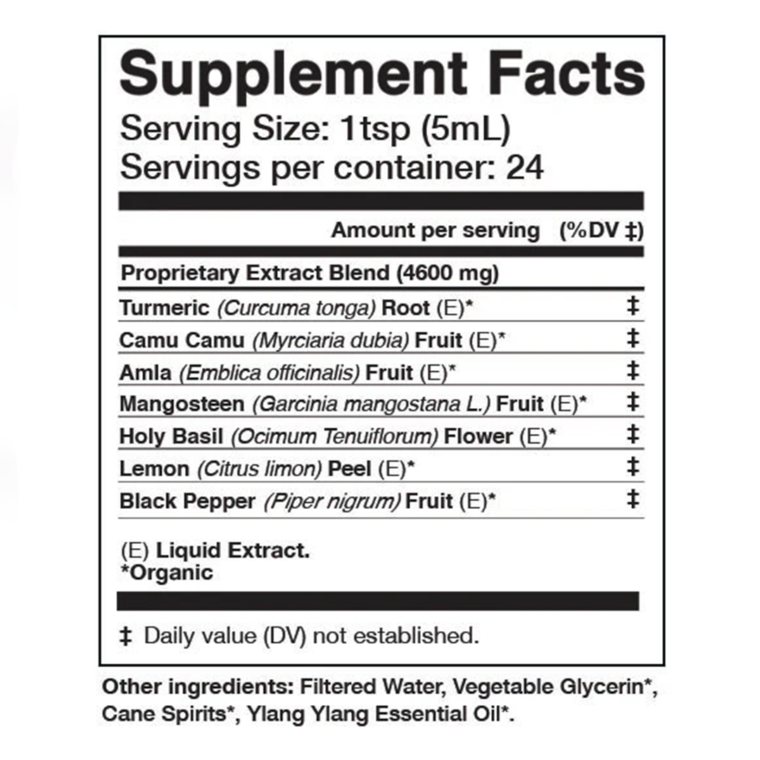 INGREDIENTS: Turmeric Root (Curcuma Longa) (E)*, Camu Camu Fruit (Myrciaria dubia)(E)*, Amla Fruit (Emblica officinalis) (E)*, Mangosteen Fruit (Garcinia mangostana L.) (E)*, Holy Basil Flower (Ocimum tenuiflorum) (E)*, Lemon Peel (Citrus limon) (E), Black Pepper (Piper nigrum) (E)