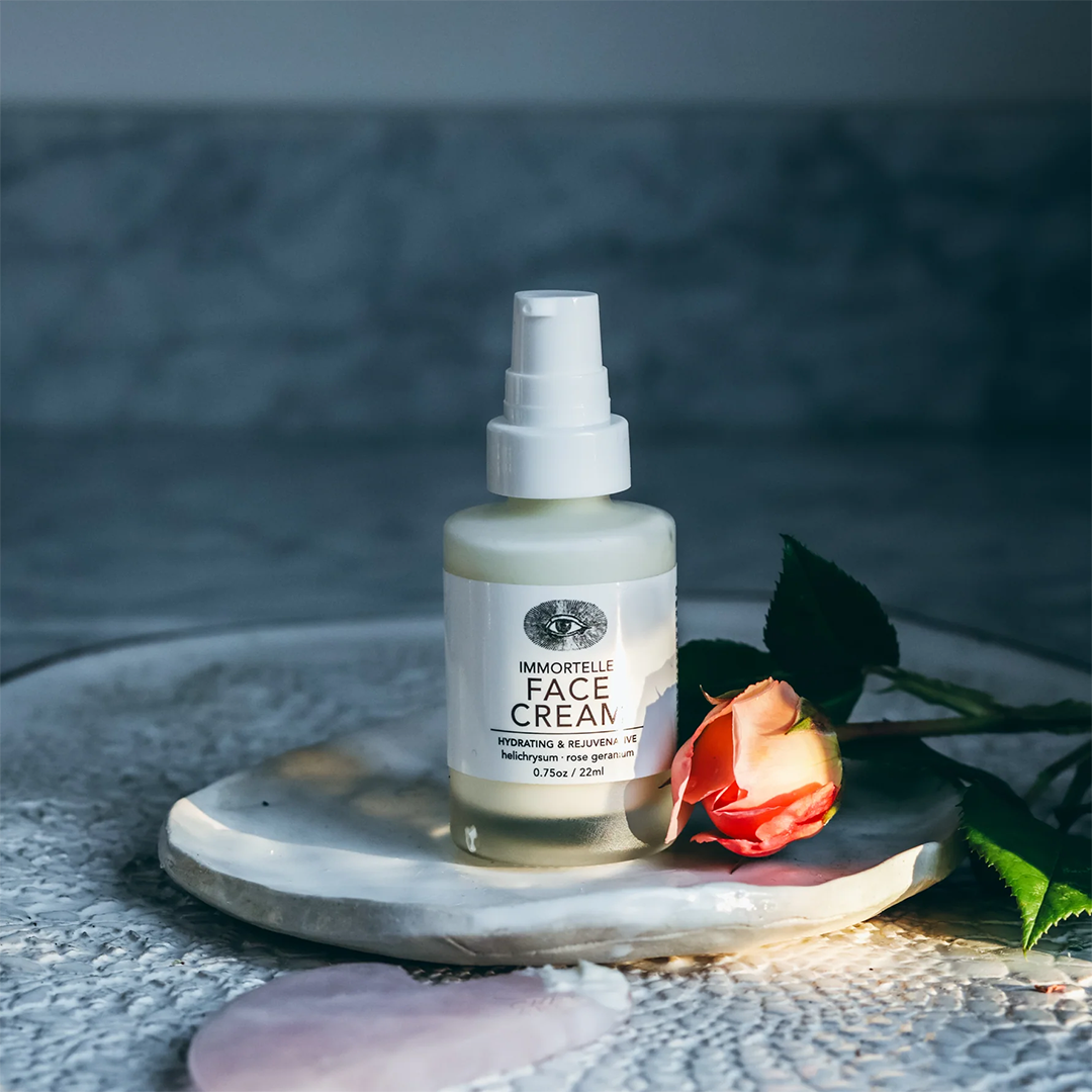 This Immortelle Face Cream is a deeply hydrating botanical blend designed to nourish and revitalize the skin. Infused with the cherished Helichrysum (Immortelle) and Rose Geranium, this cream combines soothing herbal extracts, lightweight plant oils, and rich butters to deliver long-lasting moisture without clogging pores.
