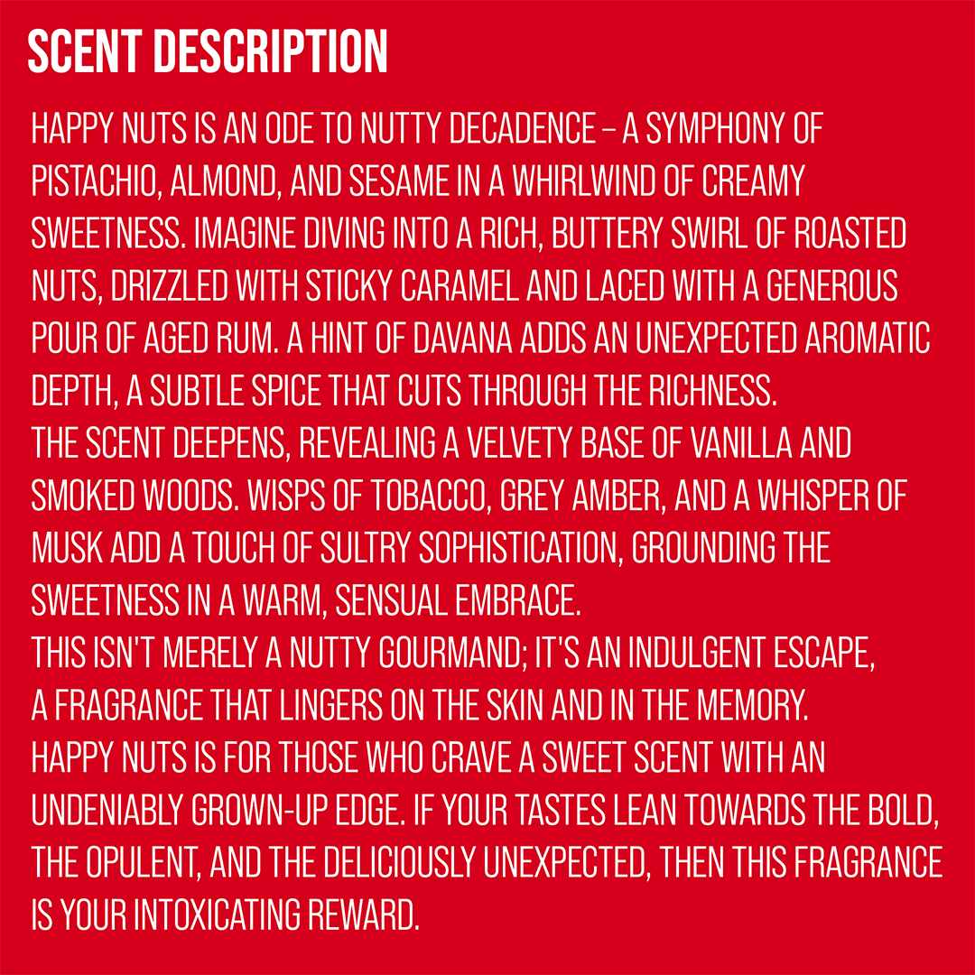 NOTES: Pistachio, Almond, Honey, Caramel, Rum, Vanilla, Davana Essence, Black Sésam extract CO2, Gaiac Wood, Tobacco, Grey Amber, Tonka Absolute, Patchouli Essence, White Musks