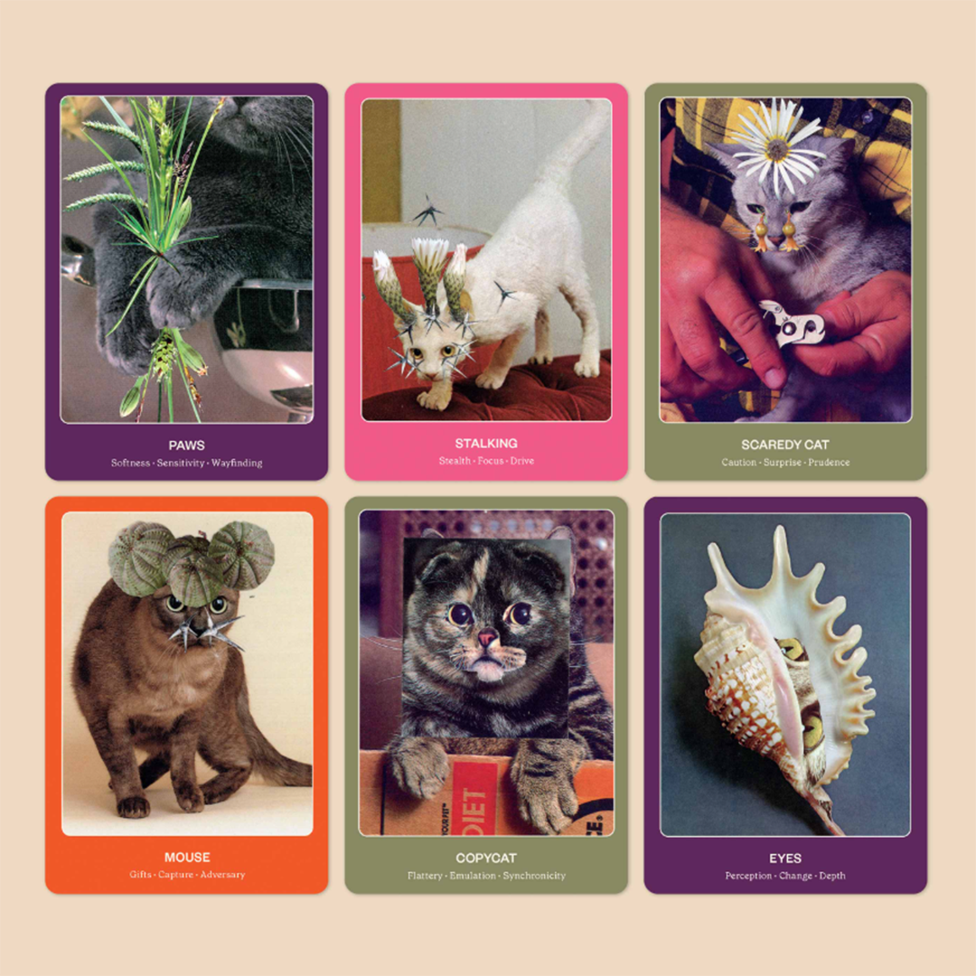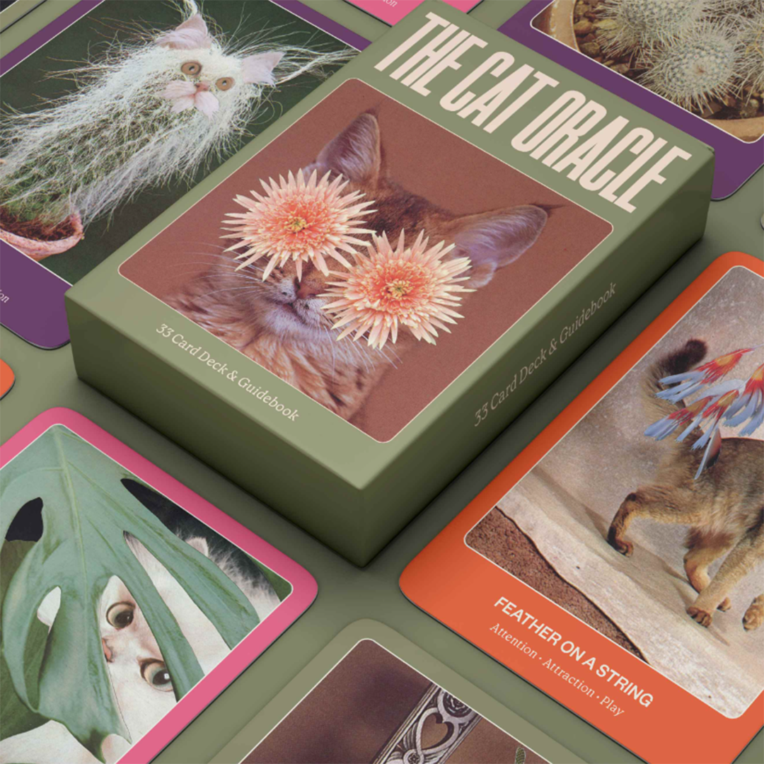 The Cat Oracle is a guide to seeing in the dark and discovering your wildest nature. These 33 cards (plus a guidebook for their interpretation) are tools for exploring cycles of zooming chaos and cozy catnaps, learning when to pounce, and finding the internal gyroscope that guides you to always land on your feet. Cats choose us. Which one will choose you?
