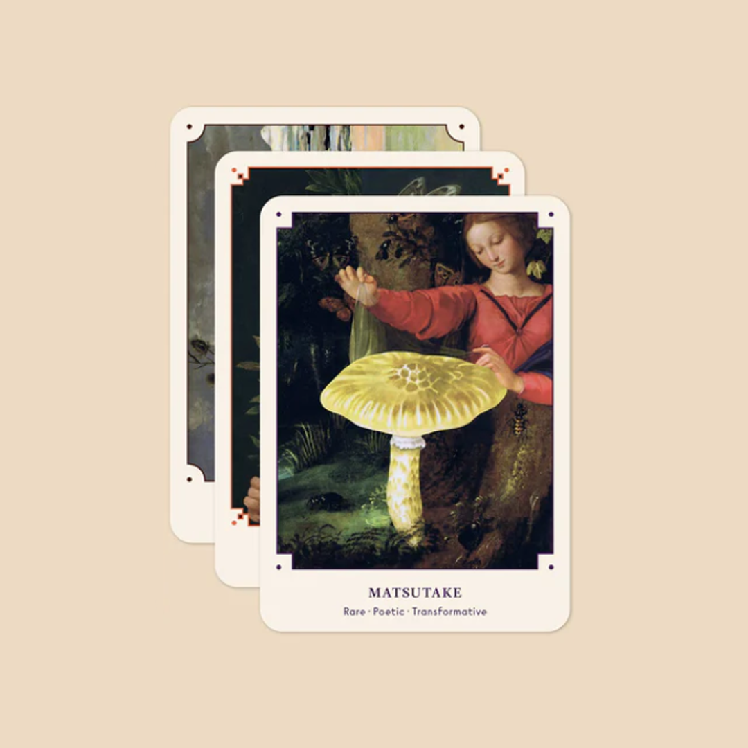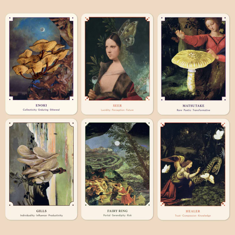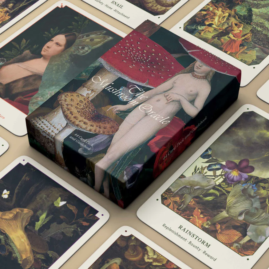 The Mushroom Oracle Deck guides mycelial thinking about the past, present, and future through 44 cards and an accompanying booklet representing mushrooms, the forest, mushroom people, and fungal structures—and the multitudes, layers, and connections each contains.