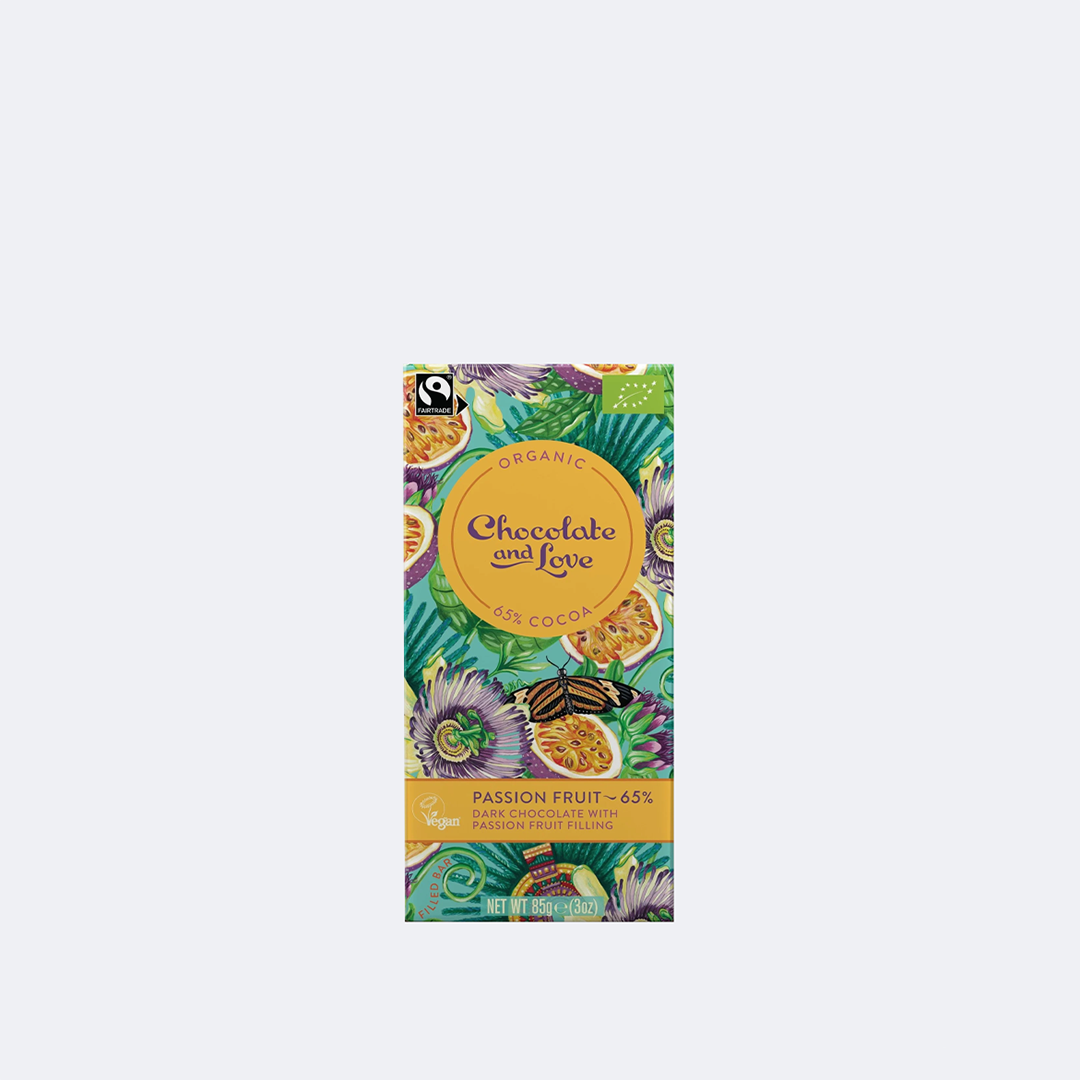 Dark chocolate bar 65% cacao with a filling of passion fruit, mango and orange, in an FSC-certified cardboard box and home-compostable inside wrapper.