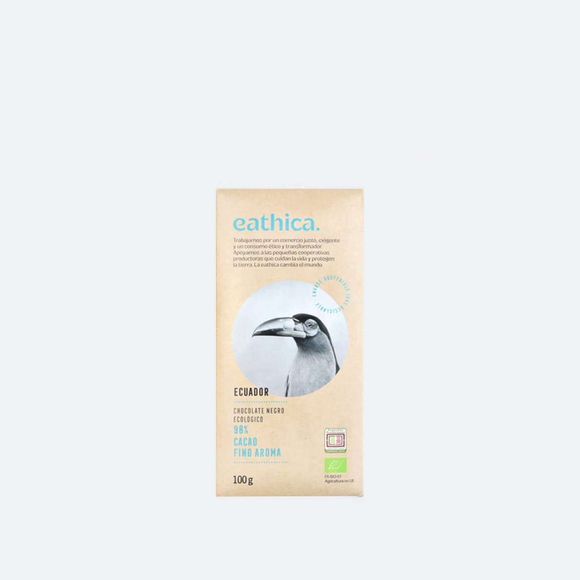 Chocolate Cocoa 98% Ecuador Bio from Ethiquable has 98% cocoa in an intense chocolate bar.