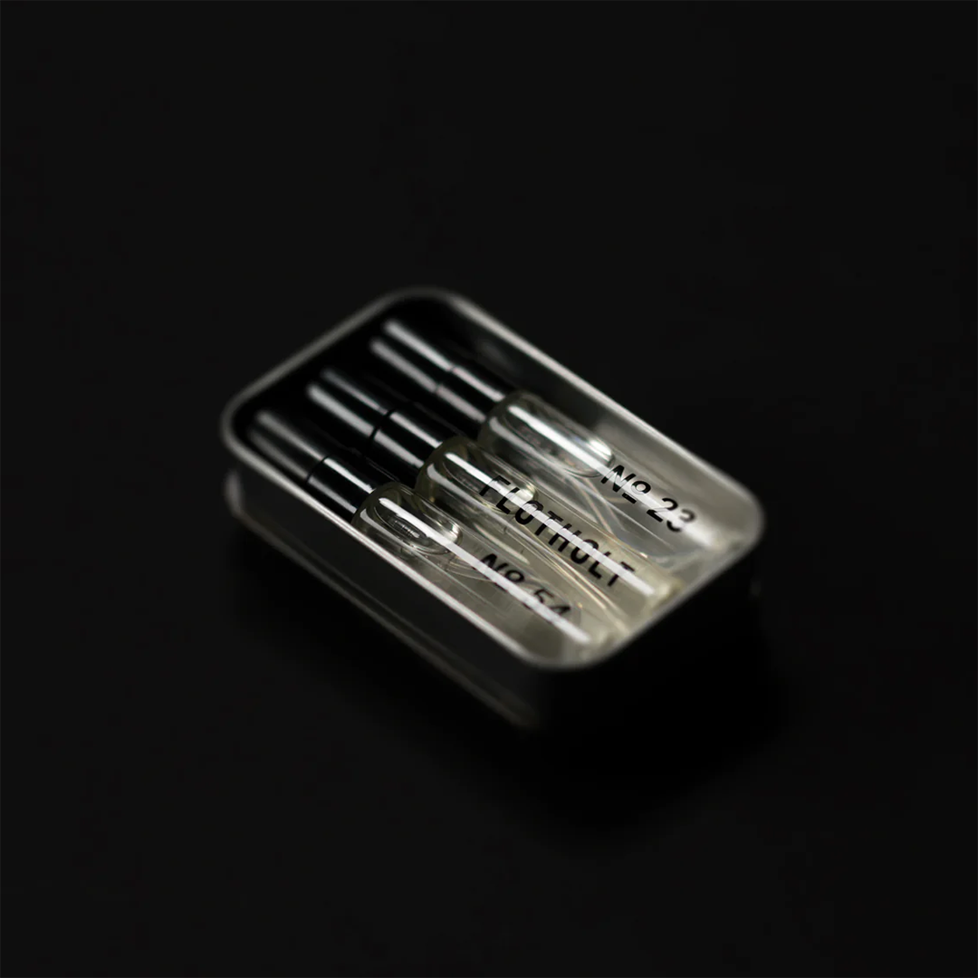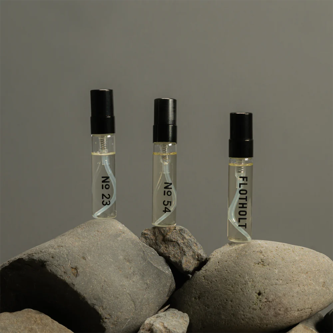 The set is housed in a hand-treated tin box made by our father Birgir, and features fragrances - No. 23, No.54 and Flotholt. A perfect way to discover your new fragrance favorite.
