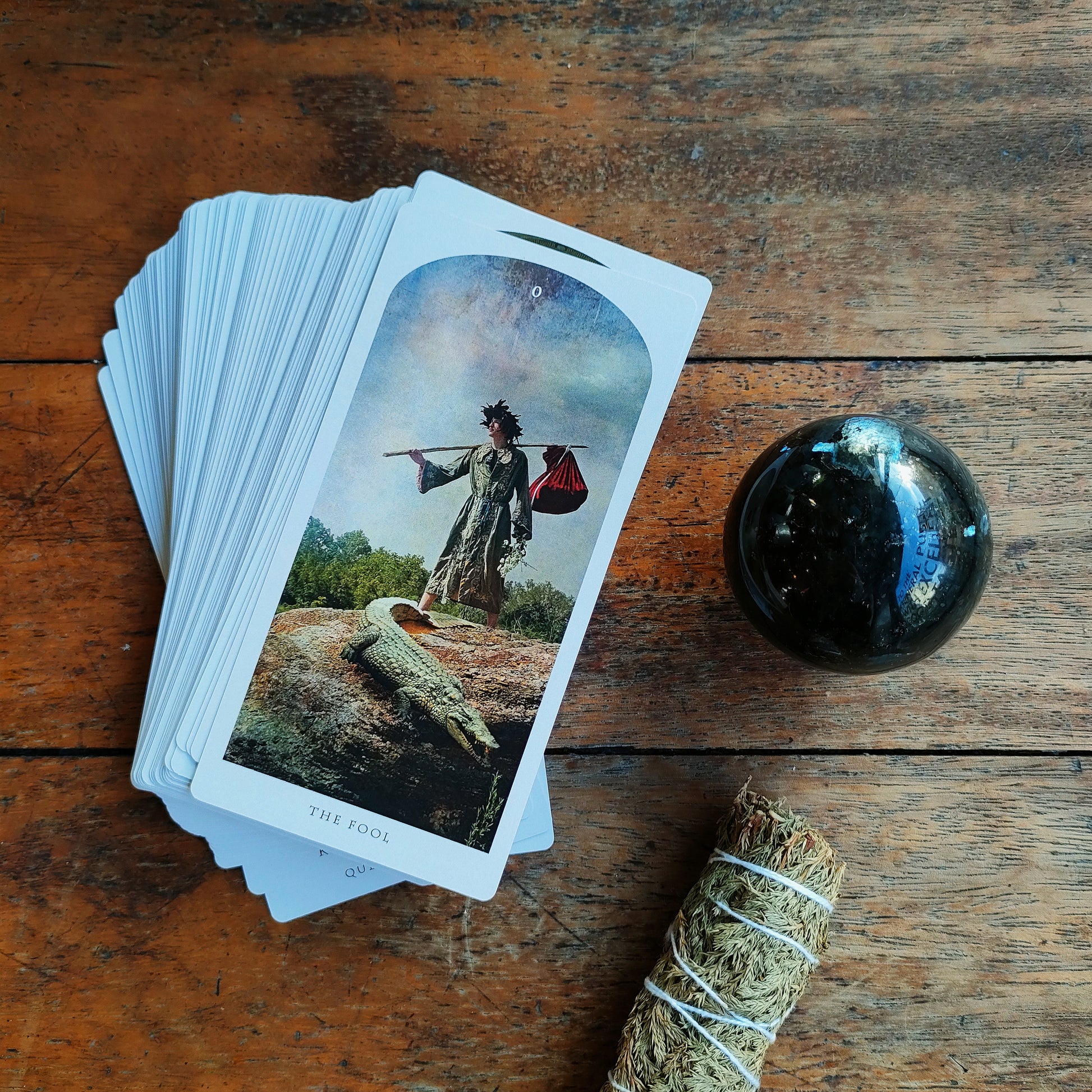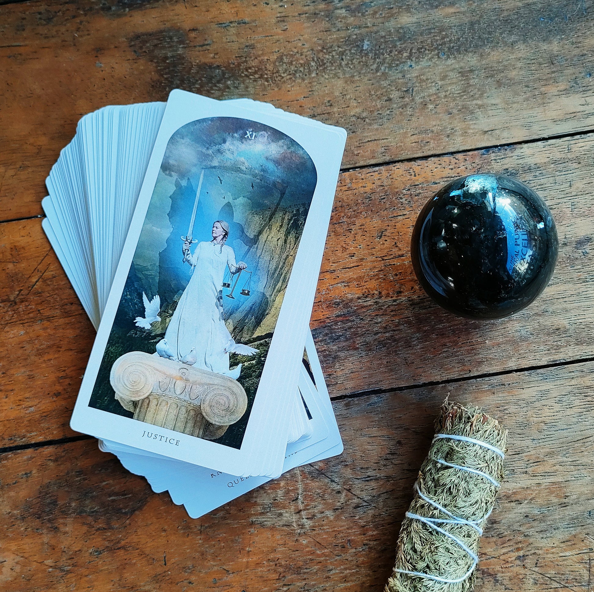 Replete with the esteemed images The Fool, Justice, the Queen of Coins, The Star, Death, the Six of Cups, and The World.