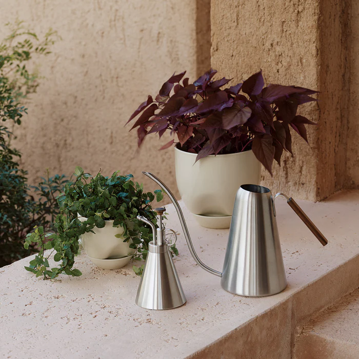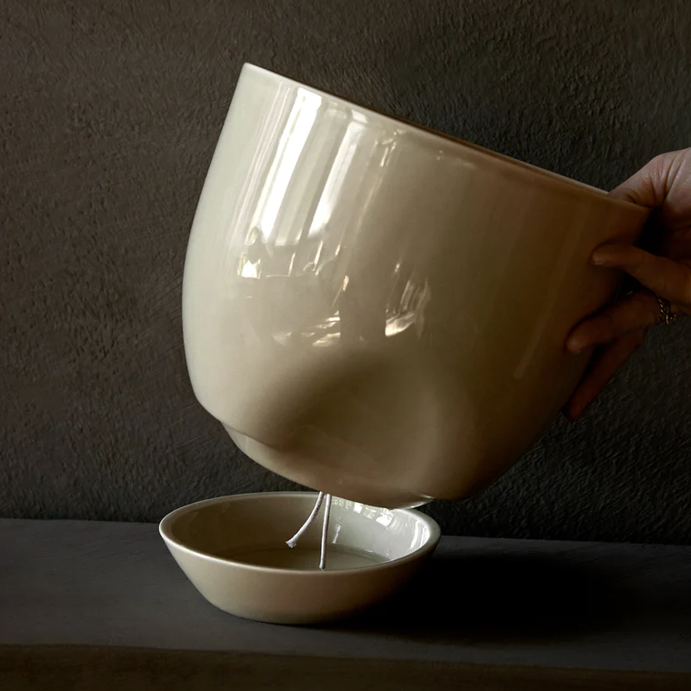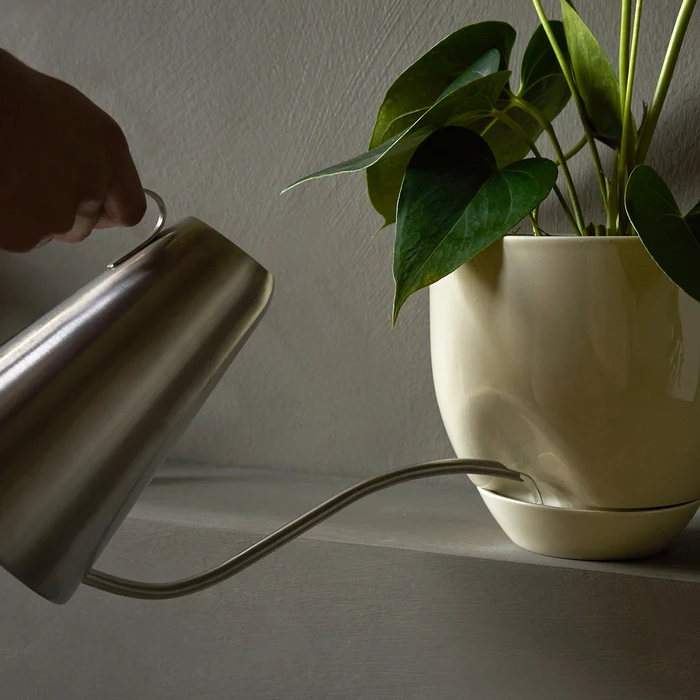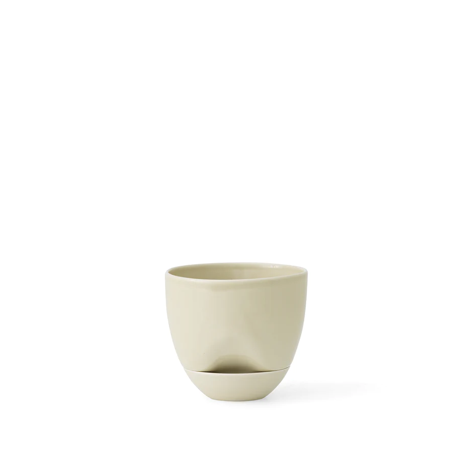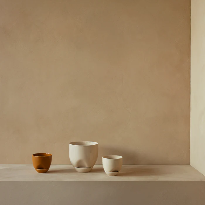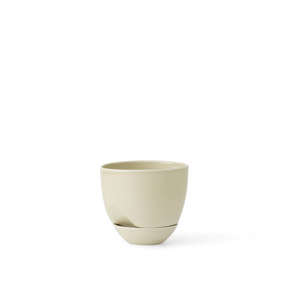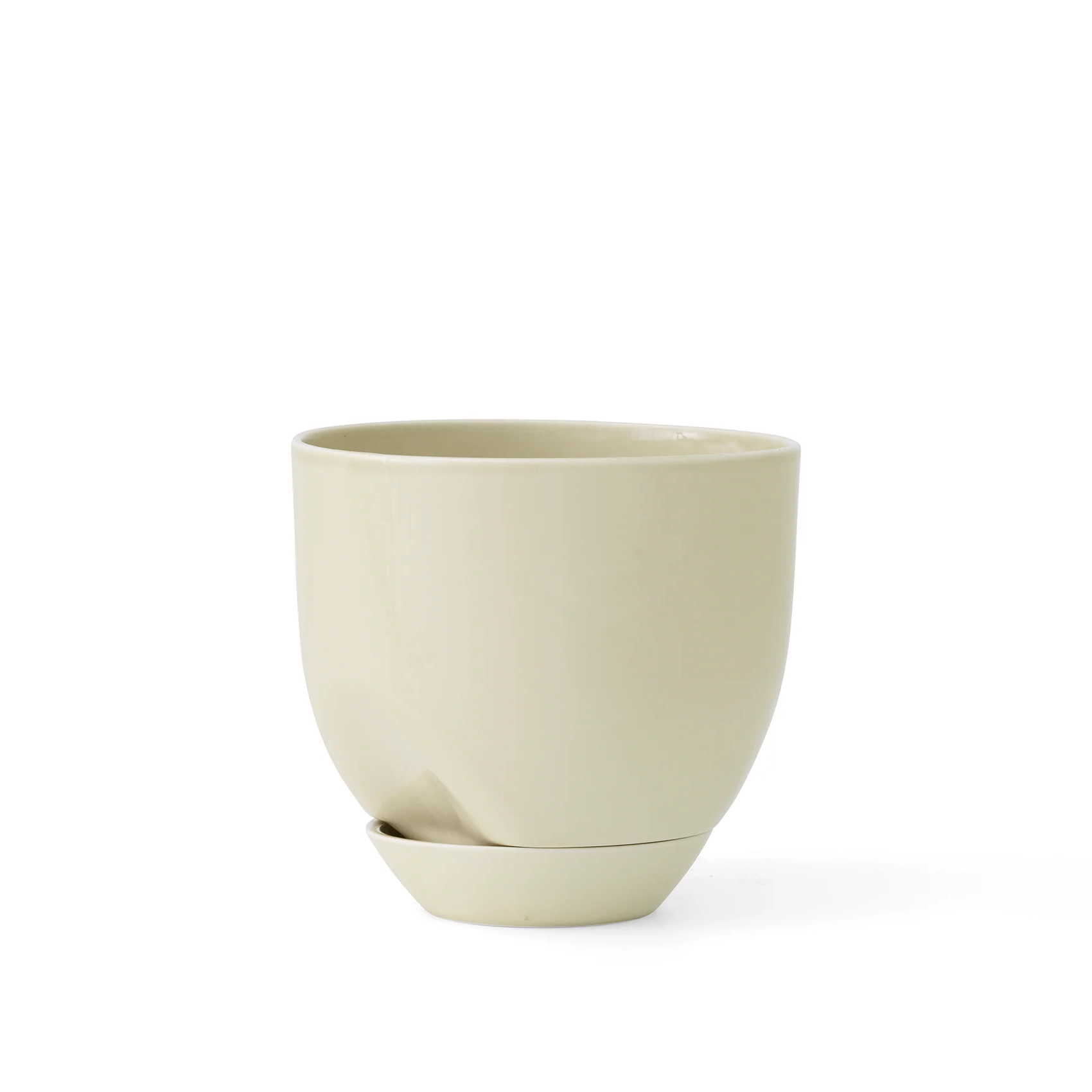 Shaped from stoneware glazed for a glossy finish, the practical design enables the plant to draw water to its roots as needed: a nylon wick transports the water from the saucer to the soil, ensuring correct hydration all year round. Available in two sizes in two colours. For indoor use only.