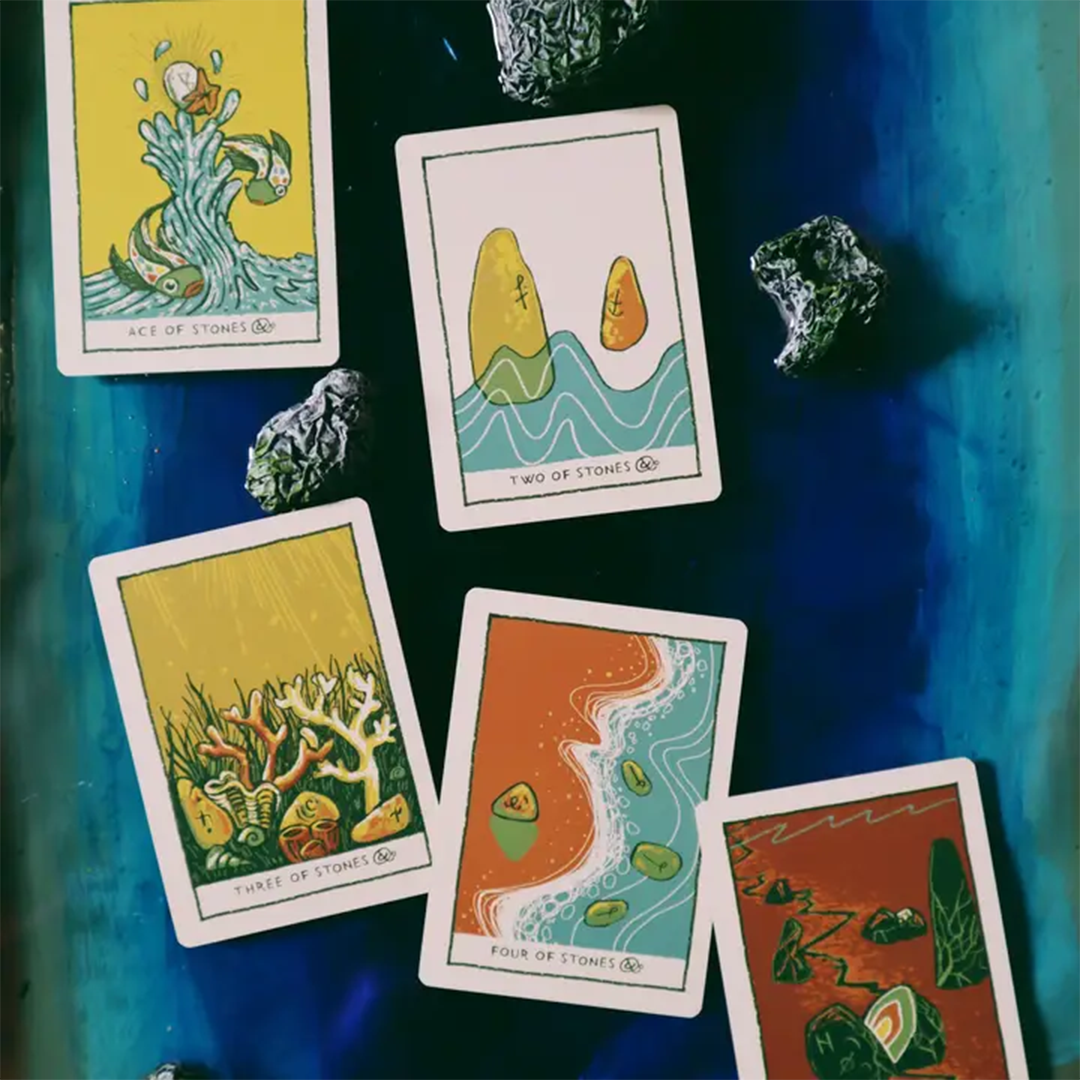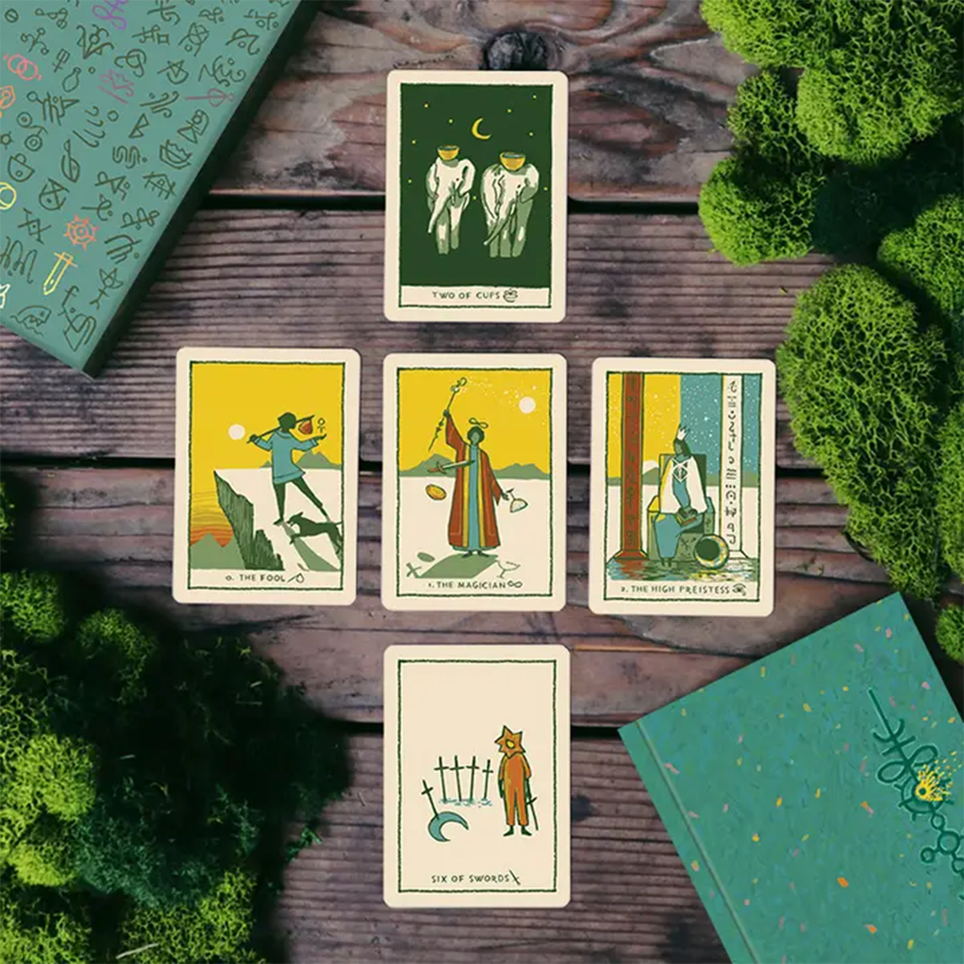 Echoing the panoramic storytelling found in other decks within the Visions Universe, the major arcana of the Green Glyphs Tarot weaves together a tapestry of tales, enabling fluid interpretations and visually cohesive narratives.