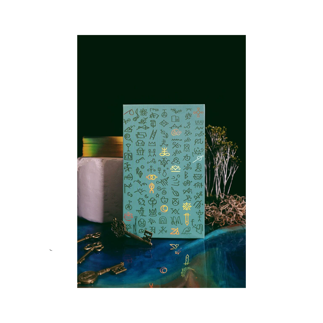 "The Green Glyphs Tarot follows the meanings of the traditional tarot system. For Tarot beginners, this is an excellent deck to begin with as the cards are color-coded based on the presence of the card. Cards with a large presence of yellows and gold are generally uplifting and cards with orange are unfortunate. A Tarot deck is split into two parts: the major and minor arcana. The deck begins with the major arcana, a group of 22 cards that explore the fool's journey and the cyclical nature of life and when assembled side by side form a long panoramic image that links back to the start. The minor arcana is comprised of 56 cards split into 4 different suits. Each suit tells a myth or story and takes the reader on a journey as an additional aid in understanding the intricacies of each suit." - James