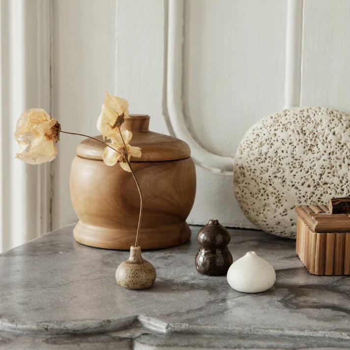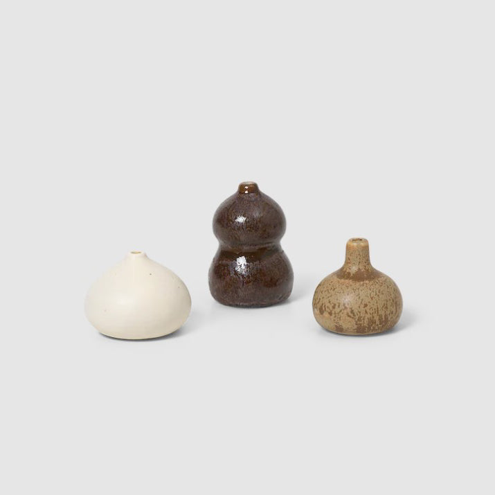 Create a decorative still life with the family of Komo Mini Vases. The small, chubby vases come in a set of three that all have their own reactive glaze, giving each of them a unique expression. Use them on your favourite bookshelf together with other cherished objects, on the table with single stem flowers or place a tray underneath to use them for incense sticks.