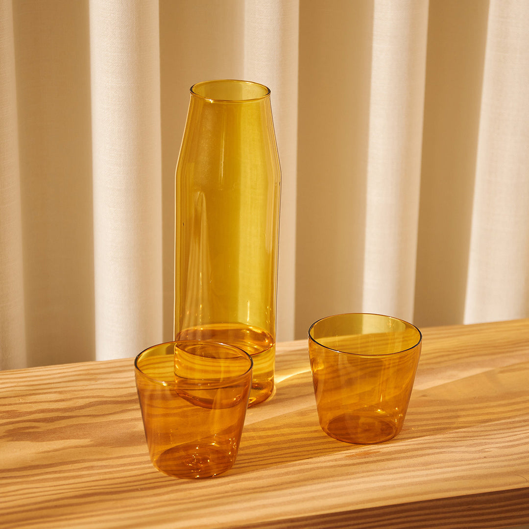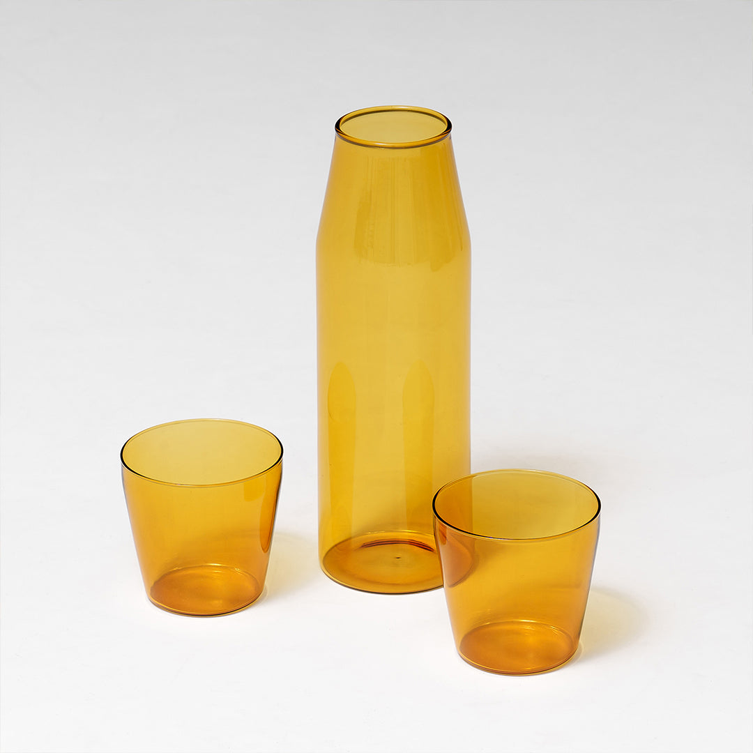 Milk is a carafe and glasses set that is inspired by the design of a traditional milk bottle. The glasses can be stacked upside-down on top of the carafe to act as a lid and for easy carrying and storage.