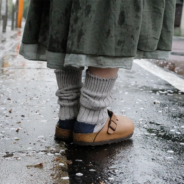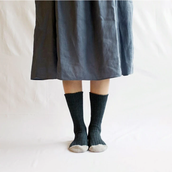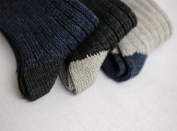 Made from 100% virgin cotton, an environmentally-friendly fiber. This material gives that worn-in comfort and look that maximizes with wear. They took the extra fine cotton fibers called virgin cotton, that remain after yarn is produced and ran it through a specialized spinning machine to create this special yarn. These socks are unique in the way that the more you wear them, the more “worn-in” it looks — just like a pair of vintage jeans. To add even more character to these socks, Nishiguchi Kutsushita used a special dyeing technique called speck dyeing which involves sprinkling dye capsules and steaming the thread, forcing the capsules to burst and create random specks of color.