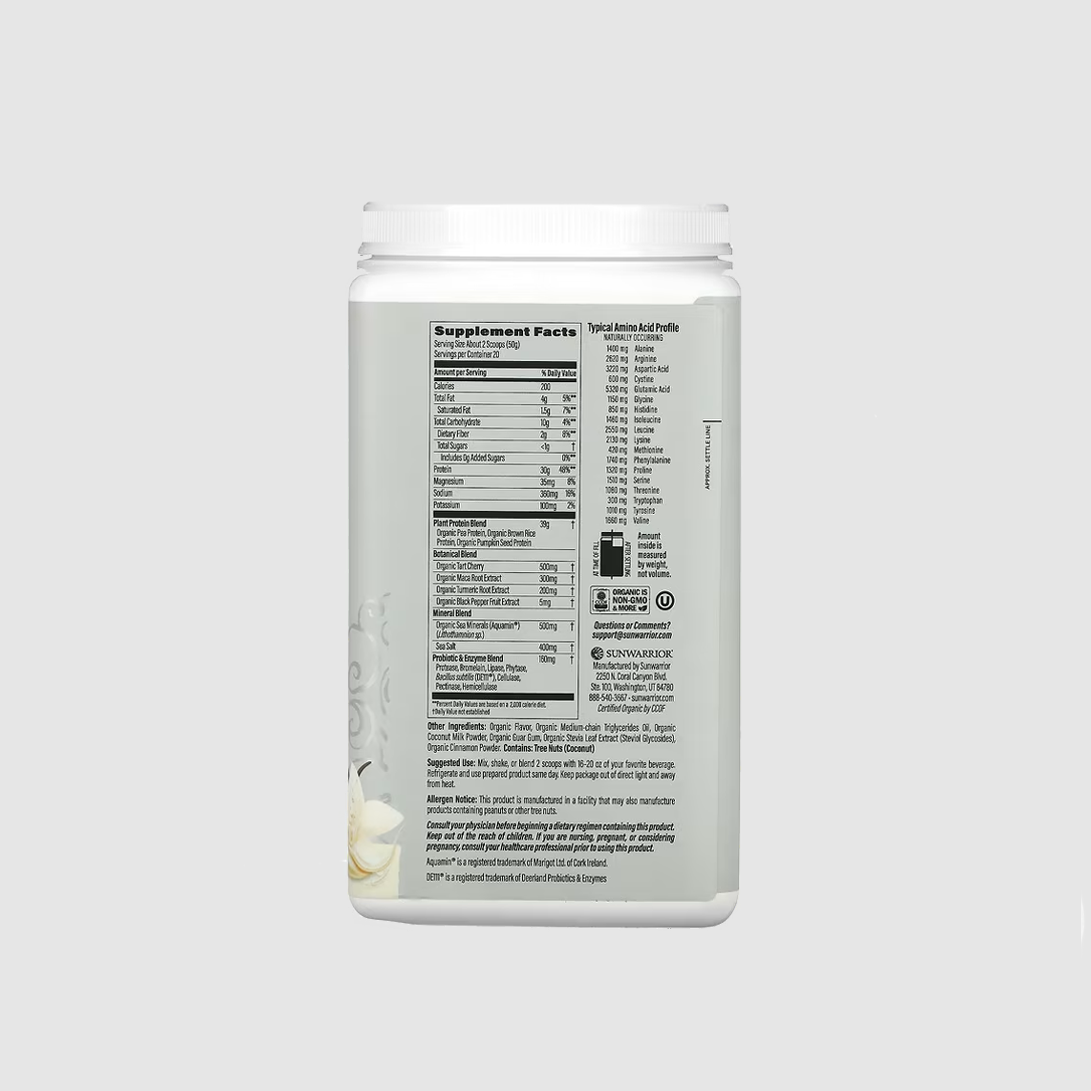 INGREDIENTS: Plant Protein Blend: Organic Pea Protein, Organic Brown Rice Protein, Organic Pumpkin Seed Protein, Organic Tart Cherry, Organic Maca (root) Extract, Organic Turmeric (root) Extract, Black Pepper (fruit) Extract Mineral Blend: Organic Aquamin® Sea Minerals (Lithothamnium corallioides), Sea Salt Probiotic & Enzyme Blend: Protease, Bromelain, Lipase, Phytase, Bacillus subtilis (DE111®), Cellulase, Pectinase, Hemicellulase Other Ingredients: Organic Vanilla Flavor, Organic MCT Oil, Organic Coconut Milk Powder, Organic Guar Gum, Organic Stevia Leaf Extract (Steviol Glycosides), Organic Cinnamon. Contains Coconut.