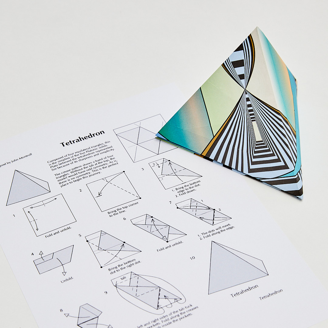 Once you have completed your multi-dimensional exploration, choose the final form your journal takes by either framing the print or transforming it into an origami polyhedra sculpture of one of the platonic solids, guided by renowned origami master John Montroll.