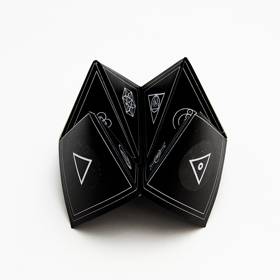 Playable fortune teller artwork by Daniel Martin Diaz and divination matrix that will allow for random navigation of the journal to reveal subtle correspondences and unlock hidden content.
