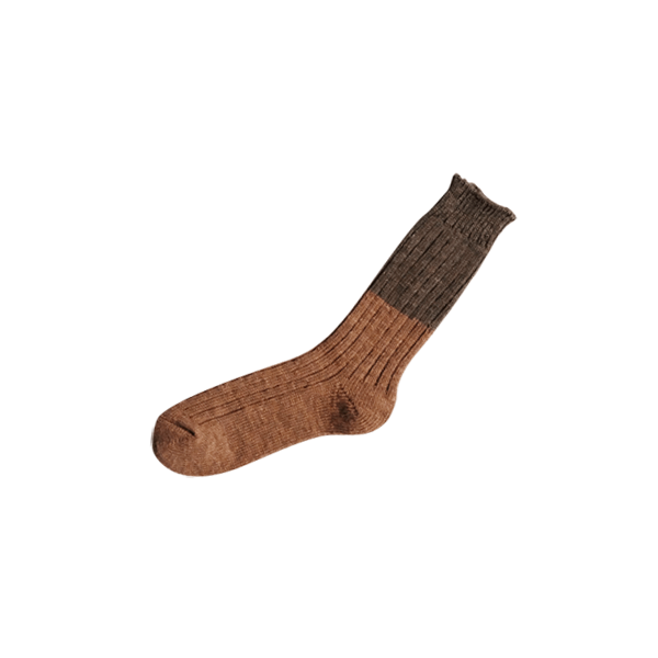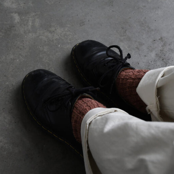 Wool and cotton are gently intertwined to create these wool-cotton socks. The vintage look and comfort maximizes with wear. These rib-patterned socks are created with wool and cotton that are gently twisted into slab style weaving. This type of weaving gives these socks a casual look and the gently intertwined yarn envelops your feet with softness and warmth. The vintage look and comfort maximizes with wear. Wool and cotton absorb the dye at different time frames. We like the variance of tones created by the dyeing process as it adds to this casual and playful look.