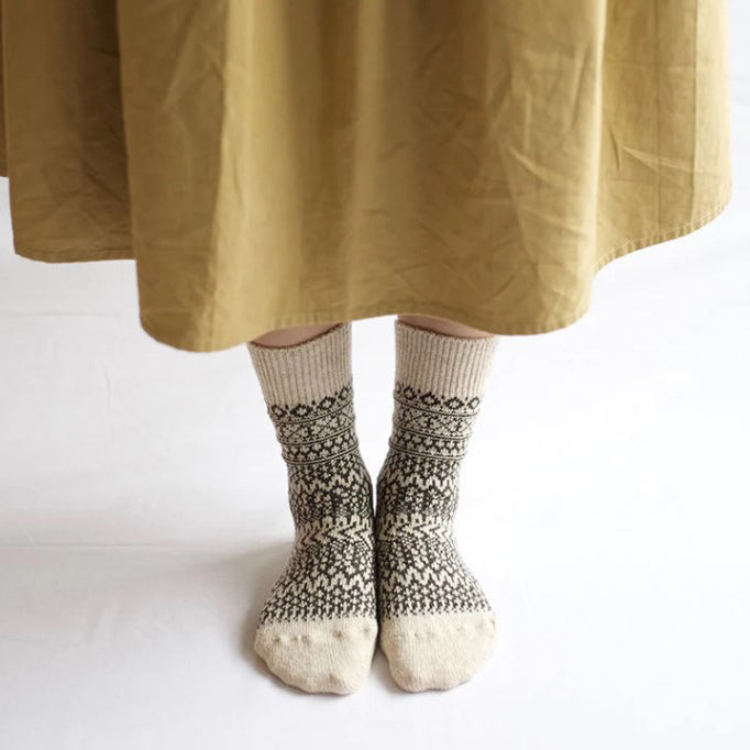 By repeatedly pre-washing the wool, we have developed a line of wool socks that are almost completely shrink-proof. Shrink-proof wool was selected to produce these Jacquard socks. This plush material has volume similar to pile — enveloping the feet in softness and warmth.